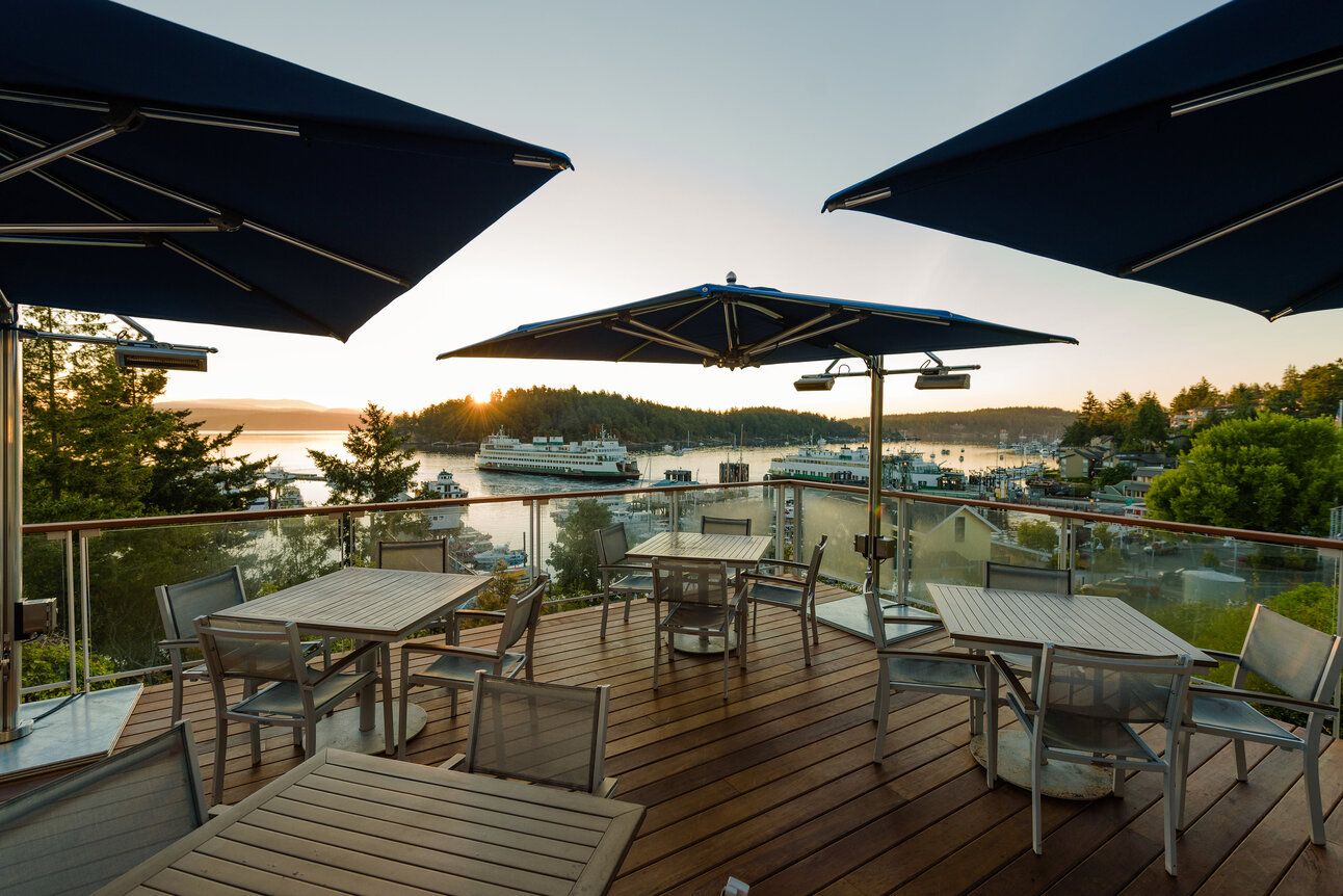 Watch the ferries and boats come and go while sipping coffee in your room or order your coffee from the restaurant while taking in the panoramic views of the San Juan Channel, ferry landing, and marina. In summer, an expansive outdoor dining area with two large decks and comfortable seating makes the ideal location to wake up with a cup of coffee.